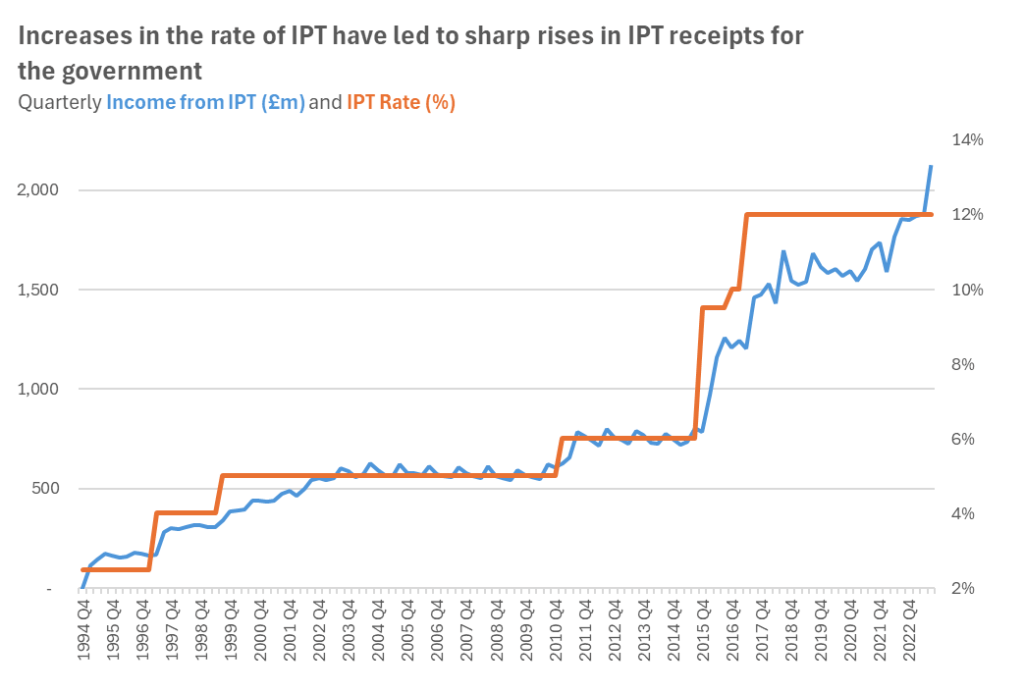 The graph below shows the government’s quarterly tax receipts for IPT (data from ONS) as well as the IPT rate since the tax was introduced in 1994.