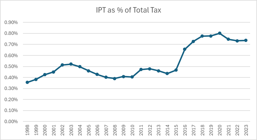 The following graph shows the proportion of all government tax receipts that IPT contributes over time to put this in context.