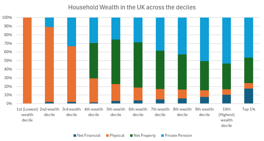 Clearly there is considerable wealth inequality in the UK, with the top 1% having £3.6m and the bottom 10% having less than £15k. Looking at the asset mix, it’s interesting to note that the wealthiest have a lower proportion of their wealth tied up in property assets, and a much larger proportion in “net financial” assets (savings and investments, minus any debt).