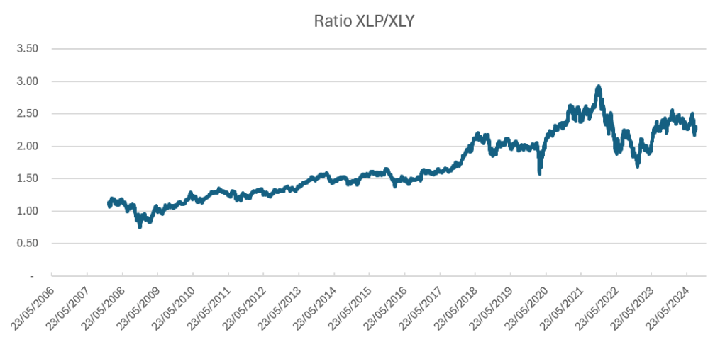 - Consumer staples ETF (XLP) to consumer discretionary ETF (XLY) ratios. This is plotted below. The higher the ratio, the more investors are moving towards value stocks which are focused on physical asset ownership and typically lower earning multiples. No ratio is suggested in the book as the trigger point for entering one or other of these, but there is some movement recently into staples, which would support adding this to the portfolio.