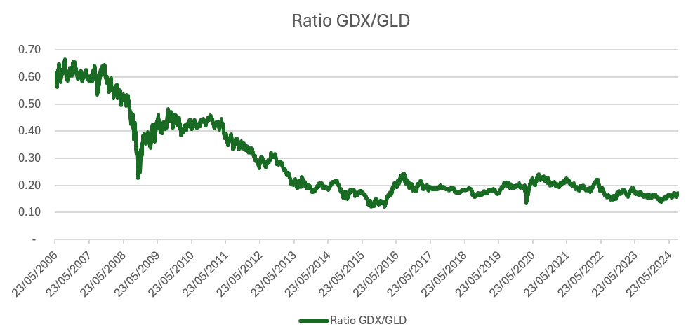 - The ratio of the gold miners ETF (GDX) to the gold ETF (GLD). According to the book a ratio below 0.15 suggests a buy signal for gold miners, with 0.2 or above suggesting a sell signal. This is plotted in the chart below, and suggests we are close to a buy signal as the ratio stands at 0.17.